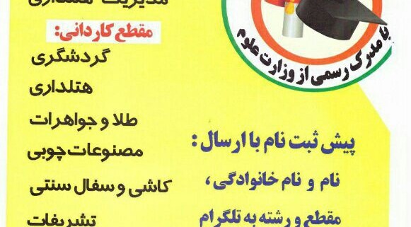 به گزارش روابط عمومی اداره کل میراث فرهنگی، صنایع دستی و گردشگری استان یزد، "محبوبه اشرف زاده" ضمن اعلام این خبر، گفت: این مرکز برای ترم مهر ماه در رشته های مدیریت امور تشریفات، گردشگری، هتلداری، طلا و جواهر، مصنوعات چوبی و کاشی وسفال سنتی در مقطع کاردانی ثبت نام به عمل می آورد.