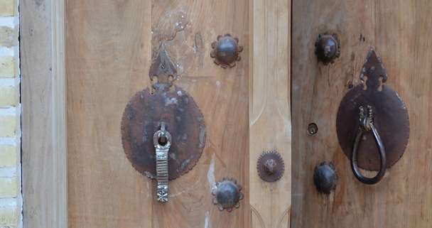 لازم به توضیح است: دربهای چوبی ورودی خانهها در بافت قدیم یزد با نقش و نگارهای مختلف، گلمیخها، لنگر و کوبههای برنجی دوگانه «مردانه و زنانه» است. کوبه مردانه دارای صدای بم و کوبه زنانه دارای صدای زیر است که صاحبخانه با شنیدن صدای کوبه متوجه میشود که مهمان رسیده مرد است یا زن، معمولاً کوبهها از برنج ساختهشده و کوبههای با قدمت بالا از این جنس هستند اما اغلب کوبههایی که امروزه در بافت تاریخی باقیمانده جنس فلز دارند که به شکل چکش و بهصورت حلقه طراحیشدهاند.»