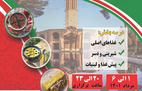 به گزارش روابطعمومی اداره کل میراث فرهنگی، گردشگری و صنایعدستی استان یزد، مصطفی سپهری روز سه شنبه ۲۸ تیرماه با اعلام این خبر گفت: «این جشنواره که مخصوص غذاهای محلی و سنتی روستایی و شهری است در ۳ بخش غذاهای اصلی، پیش غذا و لبنیات، شیرینی جات و دسر برگزار خواهد شد.»