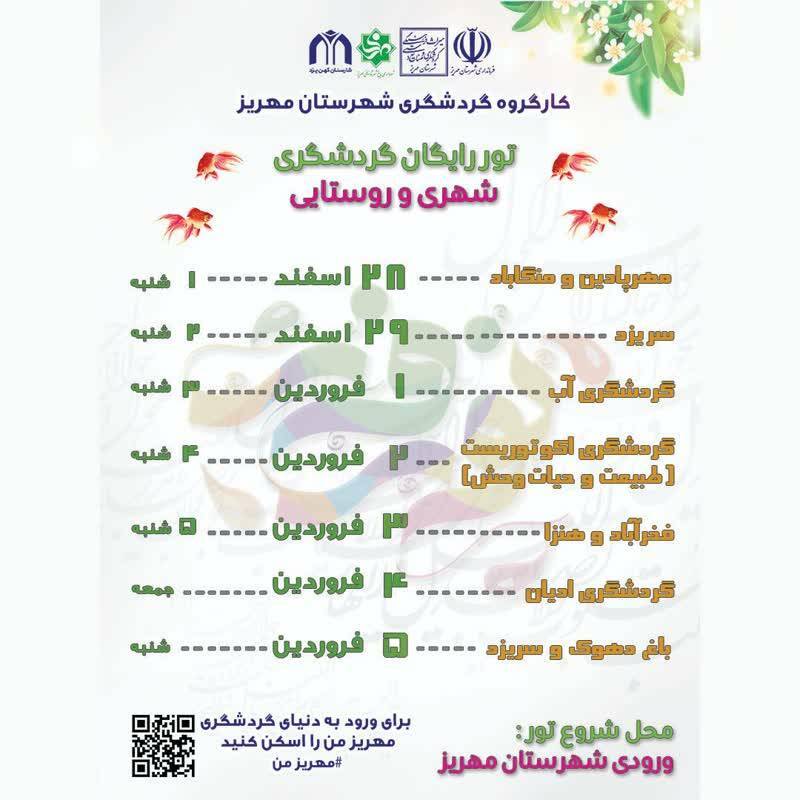 قانعی با اشاره به اینکه این تورها از ۲۸ اسفند آغاز شده و تا ۱۲ فروردینماه ادامه خواهد داشت، افزود: مهرپادین، منگاباد، سریزد، تفرجگاهها و طبیعت و حیاتوحش مهریز، مزارع شور، باغ دهوک ازجمله مسیرهای این تورهای گردشگری است.