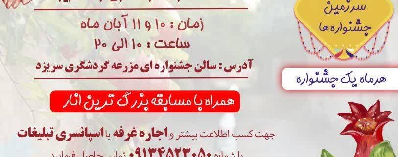 بهگزارش روابط عمومی، اداره میراث فرهنگی، گردشگری و صنایع دستی جشنواره روستا و انار به مدت دو روز در تاریخ ۱۰ و ۱۱ آبان ماه در منطقه نمونه گردشگری ارگ سریزد واقع در روستای هدف گردشگری سر یزد باهدف معرفی ظرفیتهای بالای تاریخی و گردشگری این روستا برگزار میشود.