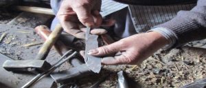 فولاد که به رنگ قرمز در آمد آن را با انبردست بر روی سنگدان که روی سکو قرارگرفته میگذارد. او در این مرحله میبایست فولاد را تکه کند و به شکل یک مستطیل کوچک (بهاندازهای که میخواهد تیغ چاقو باشد) درآورد. جهت این کار تیز بر را بر روی فولاد داغ گذارده و با چکش بر روی آن میکوبد و بدین وسیله شکل و اندازه موردنظر را درمیآورد. از آنجائیکه هر بار بیرون آوردن فولاد از کوره، موجب سردشدن و