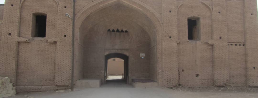 به گفته او کاربندی آجری در سر در ورودی، رواقهای پیرامون، هشتی، کنگرههای خشتی، لبههای حصار و برج بهکاررفته است.