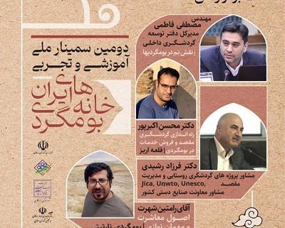 نقشتم در بومگردیها، راهاندازی گردشگری مقصد و فروش خدمات در بوم گردی، اصول معاشرت و مهماننوازی عناوین کارگاههای آموزشی این سمینار است.