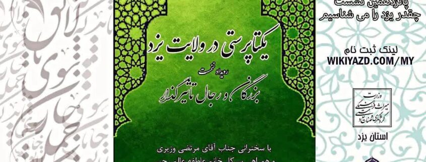 بهگزارش روابطعمومی ادارهکل میراثفرهنگی، گردشگری و صنایعدستی استان یزد، به میمنت دهه ولایت و امامت و به دعوت ادارهکل میراثفرهنگی، گردشگری و صنایعدستی استان یزد توسط کمیته تخصصی گردشگری فرهنگیتاریخی یزد پانزدهمین جلسه از سلسله نشستهای چقدر یزد را میشناسیم با عنوان «یکتاپرستی در ولایت یزد» برگزار میشود.